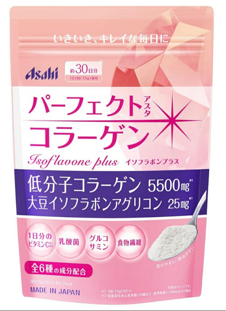 Asahi Perfect Asta Collagen Powder Isoflavone Plus версия коллагена разработана для женщин, поскольку агликоны изофлавоны сои (25 мг в суточной норме помогают: